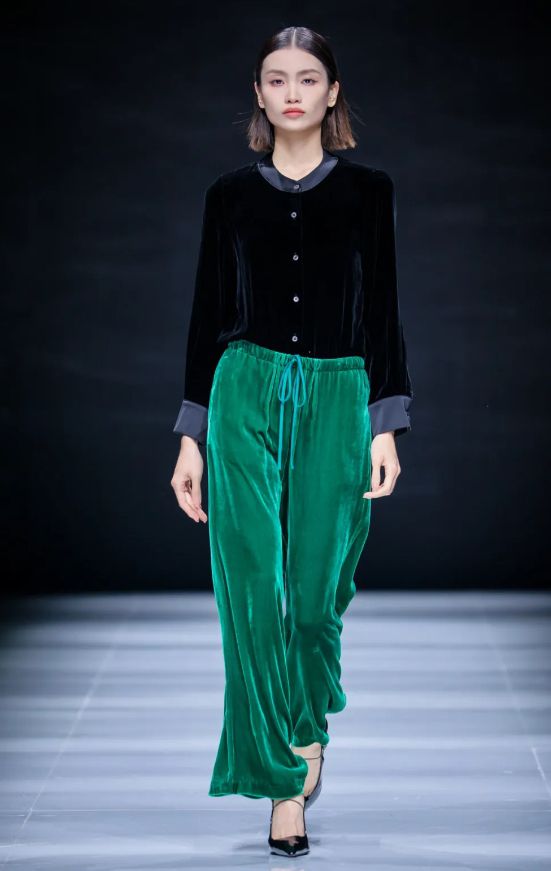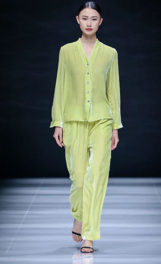 突破传统丝绒的厚重感,通过改良织造工艺与后处理技术,使丝绒呈现出前所未有的轻盈与灵动。面料在保留桑蚕丝天然光泽与垂感的同时,更具现代时尚气息。