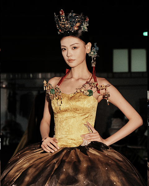 运用传统绞织工艺,分别为,非遗云锦,非遗苏绣,非遗苗绣,以及非遣点翠等传统技艺进行创作,用后现代的表现手法去诠释过去与未来的美好生活,衍生新中式文化,再次重生。 当今社会与过去有所不同的是,古人的穿搭具有独特的艺术性,和戏剧性。而如今的现代人更倾向于简约时尚,缺乏内核的力量,精神文明缺失,审美缺失。而达官贵人。更讲工艺更加共情,我把人生的美好与希望分享给这次时装周,2组用不同的时期整体设计,去演变历史的变化。灵感来源于当下的人文精神归位。