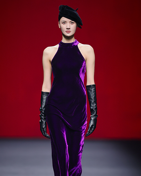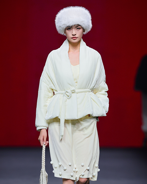 在面料运用上,我们突破传统丝绒的厚重感,改良了织造工艺与后处理技术,设计方面,以立体剪裁重构传统袍服的平面结构,赋予服装“一衣多穿”的适应性,呼应现代都市生活的多元场景需求。工艺亮点在于非遗技艺的现代化转译,在丝绒表面形成虚实相生的纹理;通过这场走秀,我们希望向消费者传达:真正的文化传承不是对过去的复制,而是让传统在当代生活中获得新生。每一件服装都是文化基因与时代精神的共生体——当穿着江南采桑子服装时,不仅是穿着时尚的服装形态,更是在参与一场关于传统与现代、个体与文化的对话。我们期待消费者能感受到,服装不仅是身体的包裹,更是承载文化记忆与情感共鸣的媒介。
